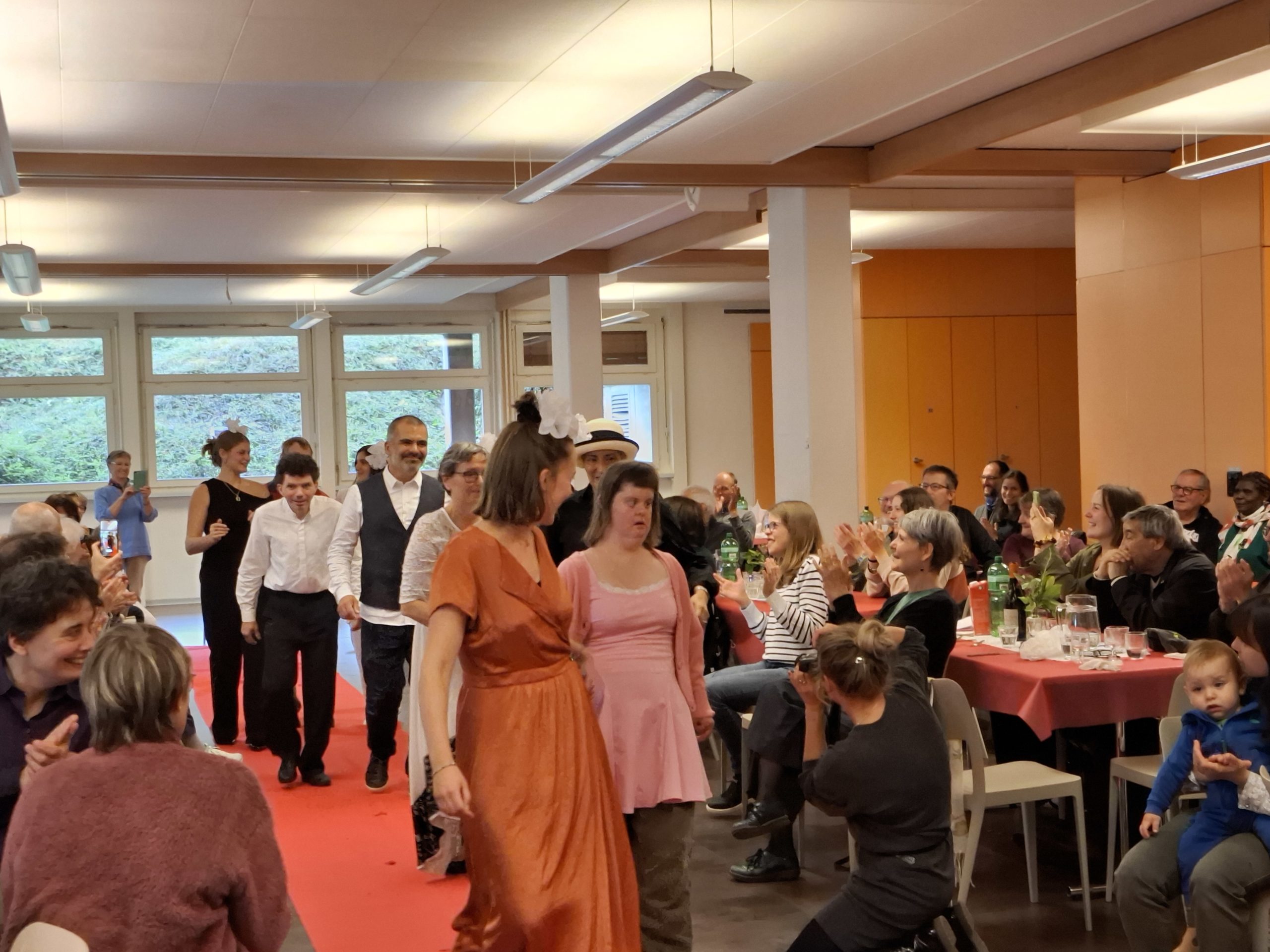 Comme à notre habitude, la fête a commencé par une messe animée par un groupe de L’Arche Fribourg et célébrée par l’Abbé Jacques Doutaz. La célébration a été suivie d’un bon repas partagé dans la salle paroissiale. Entre le plat et le dessert est venu le temps du défilé de mode. Ce sympathique moment rempli de surprises a illuminé les visages de notre public. La créativité de nos top-modèles était digne des plus grands ! Nos stars de L’Arche ont brillé lors du défilé. A l’occasion de cette fête « Haute couture », nous avons eu la chance d’avoir un invité de marque qui a même participé au défilé de la Grotte : notre cher André Coquoz a pu profiter d’un joli temps de fête avec tous ses compagnons de L’Arche. Pour conclure la fête en beauté, nous avons tous eu droit à un bon gâteau au chocolat qui a su mettre tout le monde d’accord. Un grand merci à chacun.e pour la précieuse collaboration et vivement l’année prochaine pour fêter ensemble, comme nous savons si bien le faire ! Emilie