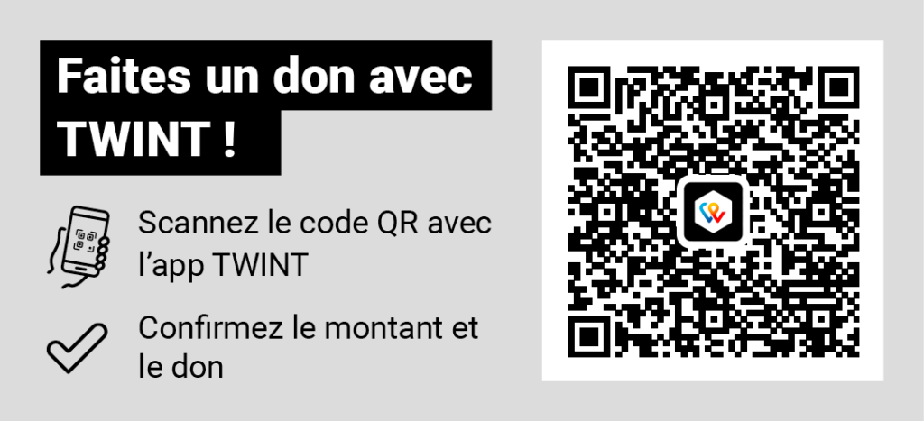 Les dons peuvent être effectués par virement bancaire ou par Twint (2,6% de frais). Pour optimiser l’usage de votre soutien, nous ne proposons pas le paiement par carte de crédit.