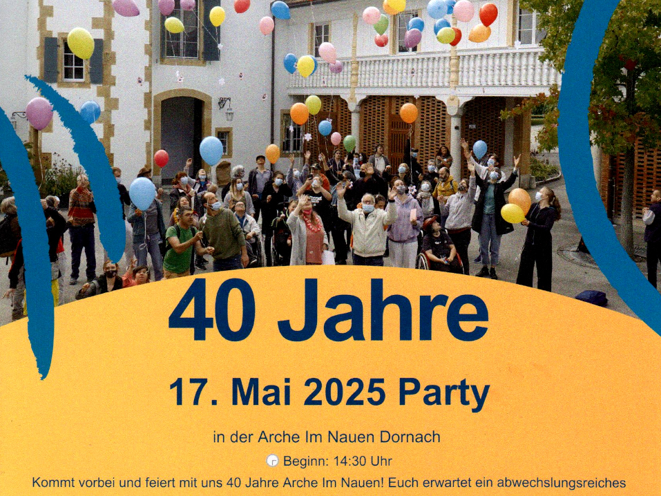 L’Arche Im Nauen fête ses 40 ans ! Elle vous invite le 17 mai 2025, Unterdorfstrasse 18 à Dornach, dès 14h30, pour une fête pleine de vie, avec des souffleurs de bulles géantes, des clowns, des conteurs, des gâteaux, de la musique, les produits de ses ateliers. L’après-midi se terminera par une disco et une grillade.